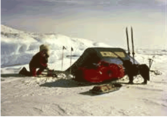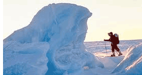 Resolute De là, Helen Thayer a pris un avion et a été déposée sur un point encore plus au nord, là où il n´y a que les ours, la mer gelée, le vent et le froid. Elle avait une carte détaillée, une boussole solaire et un GPS expérimental, à l´essai. « À mon côté Charlie, harnaché à son propre traîneau et sa laisse fixée à ma ceinture, s´assit sur son arrière train, attendant patiemment la suite. C´était le 30 mars 1988 et nous étions prêts à partir pour le voyage le plus risqué de notre vie » (37)
